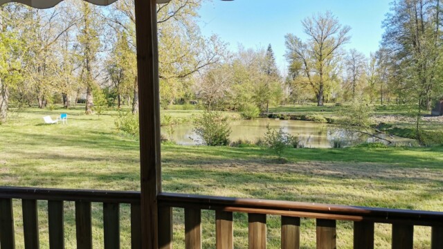 Directement face à l'étang poissonneux dans le parc du Moulin de 5 hectares où les Hérons cendrés et d'autres espèces viennent y pêcher au côté des ânes et chèvres du Moulin…