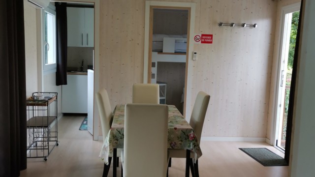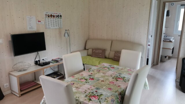 Salle à vivre, canapé, clim en été, chauffage en hiver, TV avec chaines de la TNT SAT, salon, coin cuisine tout équipé, 2 chambres indépendantes dont 1 avec un grand lit et 1 avec deux lits 1 personnes, salle de douche et wc séparés.